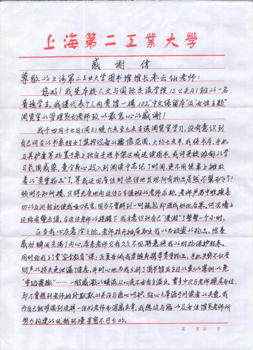 2013年4月25日,图书馆收到了来自人文与国际交流学院一年级学生瞿倩同学的一封感谢信,信中提到图书馆阅览室老师悉心保管其遗忘在阅览室内的电脑等物品,避免了贵重物品的丢失,对此该同学十分感激。近年来,随着图书馆环境及各类功能设施的不断完善,吸引了大量师生到图书馆来学习。在这个过程中,图书馆工作人员面对管理人员少、服务对象多、管理范围大等困难,一方面认真履行馆员的职责,另一方面义务担当起同学们遗忘物品的保管员,用自己的关爱赢得了师生的赞许。这封信尽管只是图书馆日常服务管理中的一个个例,但恰恰反映了图书馆馆员的敬业精神和服务理念,图书馆热情欢迎广大师生到图书馆来学习。以下是该同学通过书信的方式表达对图书馆管理人员的由衷谢意,现转发如下: