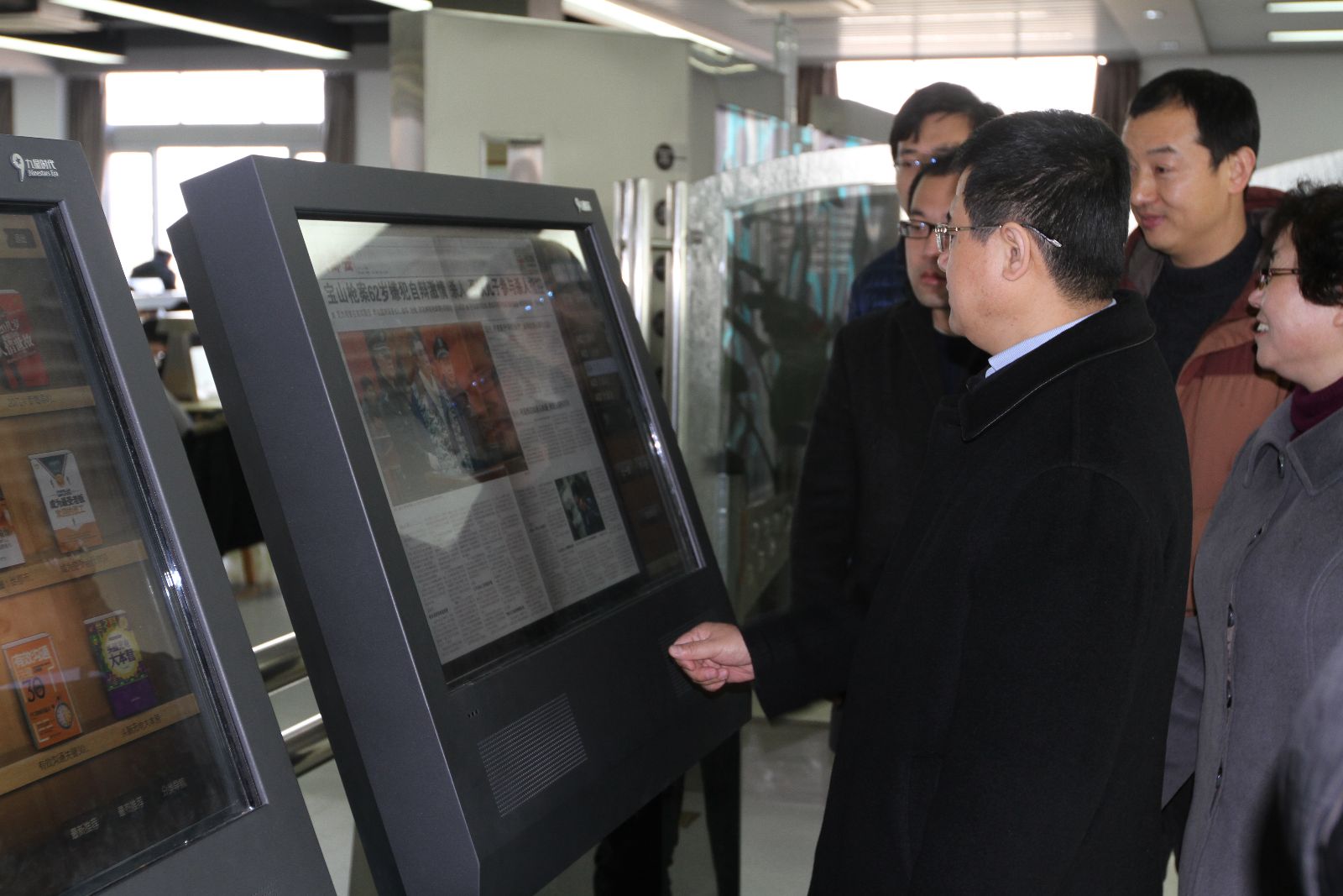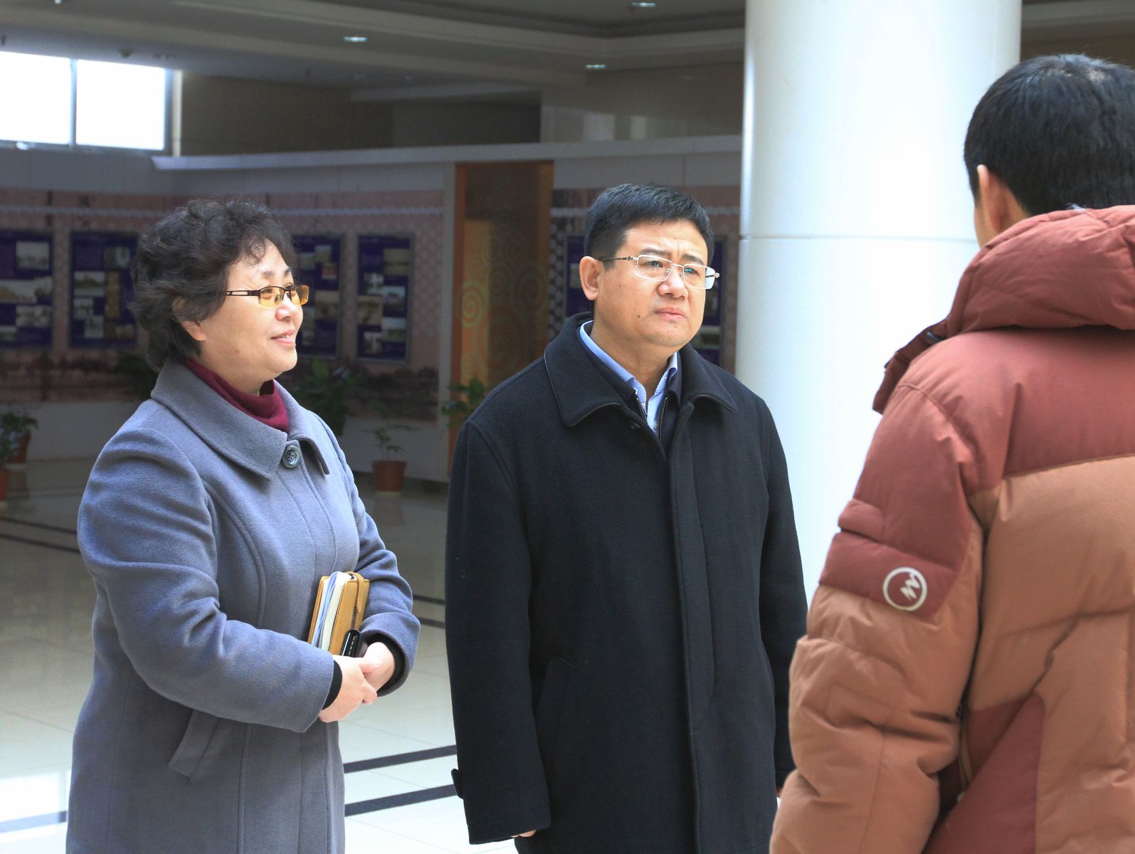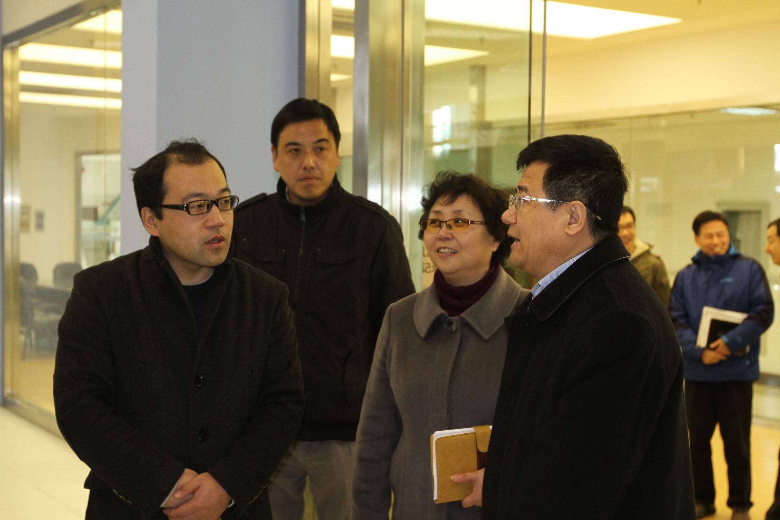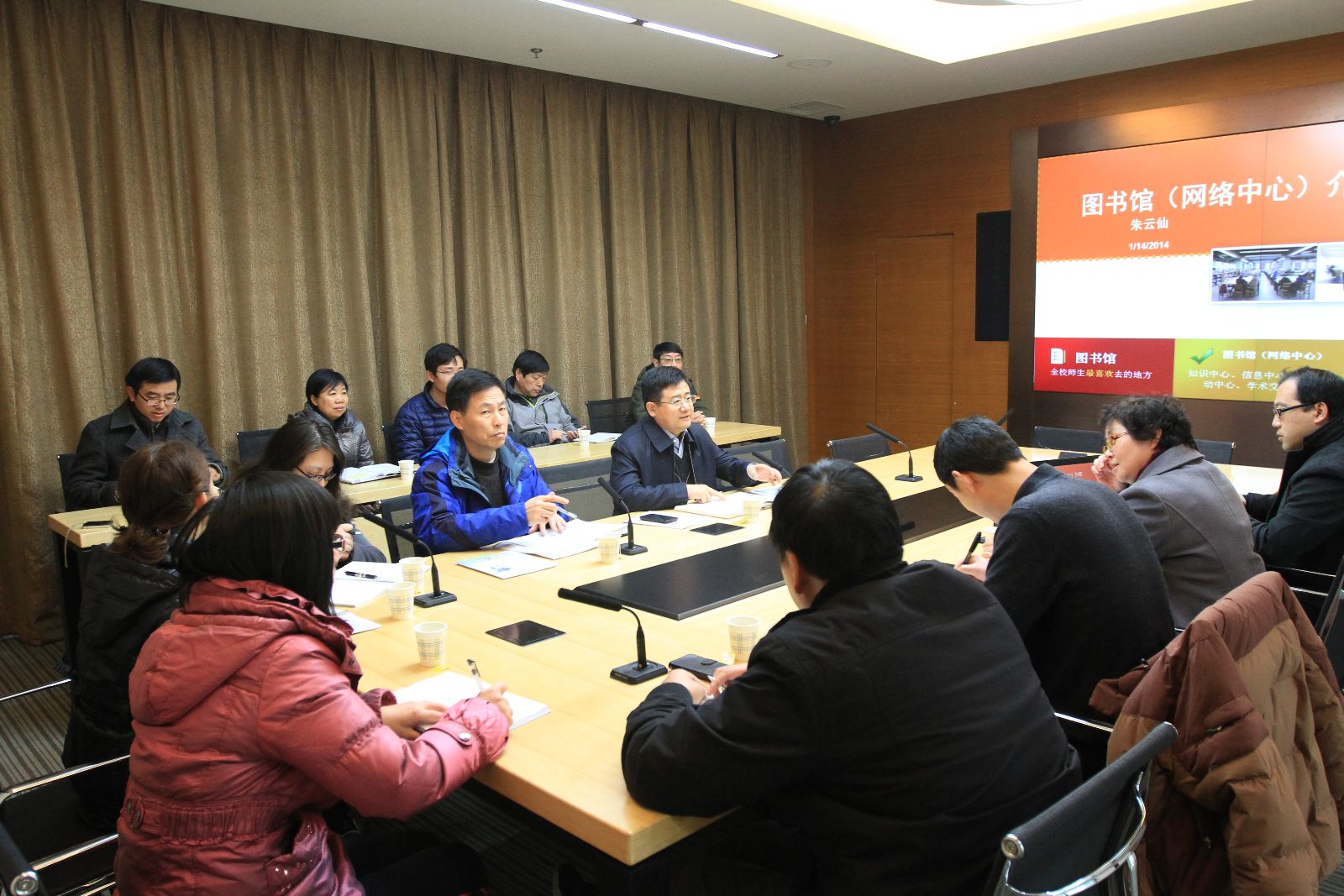 1月14日上午,党委书记宋宝儒、党办主任顾文业深入到图书馆(网络中心)调研。朱云仙馆长、常峥斌书记及苏彦君副馆长陪同宋书记一行仔细参观了图书馆(网络中心)的馆舍。随后,宋书记一行来到二楼视频会议室——望霞室,听取了朱云仙馆长的图书馆(网络中心)工作汇报并进行了充分的交流。