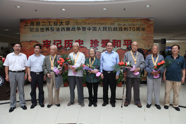 仪式上,俞涛校长代表学校,向曾经参加过抗战,曾经为学校发展而付出辛勤劳动的5位老同志代表颁发荣誉勋章。我校党委副书记邹龙飞和曹路镇党委委员、宣传部部长顾方强共同为《抗日战争主题文献库》上线活动揭幕。党办主任顾文业和图书馆(档案馆)馆长吴珞共同为《勿忘历史重读经典》抗战事迹主题图书展揭幕;上海高校图书馆工作委员会副秘书长、上海交通大学图书馆馆长林皓明和我校党委宣传部部长黎霞共同为《牢记历史珍爱和平》上海—圣彼得堡主题图片巡展揭幕。