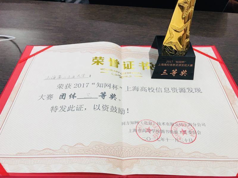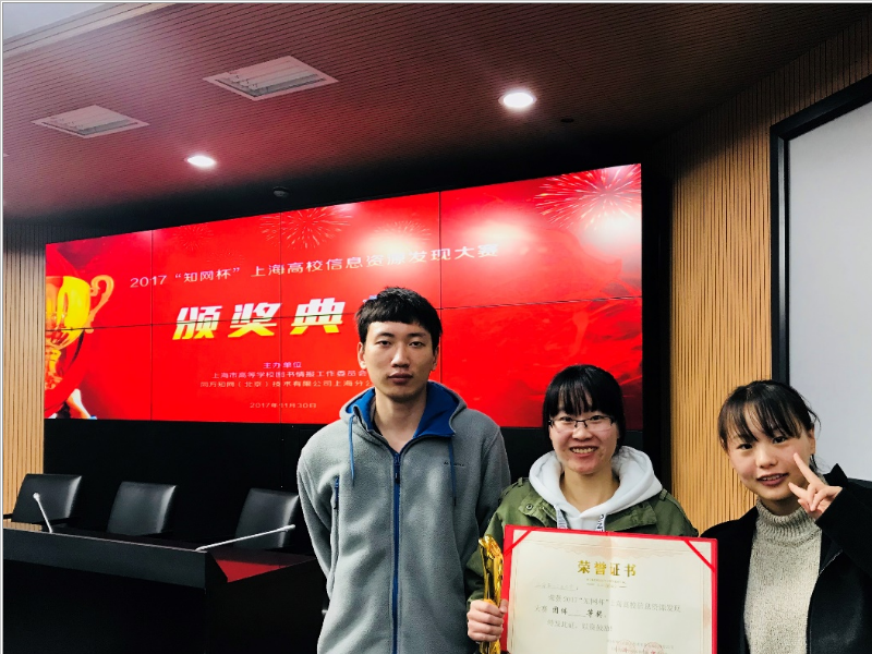 2017“知网杯”上海高校信息资源发现大赛决赛于11月30日在华东师范大学图书馆举行。我校经管学院孙赟杰,文理学部葛晴和杨亚男等三位同学通过对图书馆《文献信息检索与论文写作》课程的认真学习,从初赛中脱颖而出进入决赛,最终取得了决赛团体三等奖的佳绩。