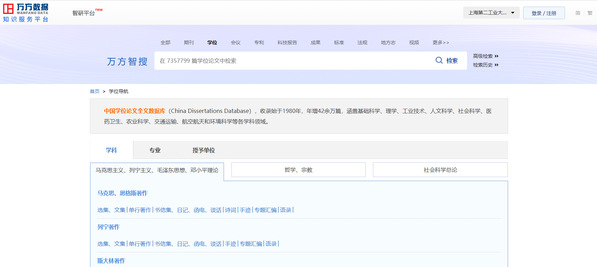中国学位论文全文数据库·增强版,收录的学位论文来自988家授予学位单位,其中双一流高校144家,以及全部211高校和985高校。收录硕士论文、博士论文70万余篇,涵盖基础科学、理学、工业技术、人文科学、社会科学、医药卫生、农业科学、交通运输、航空航天和环境科学等各学科领域。